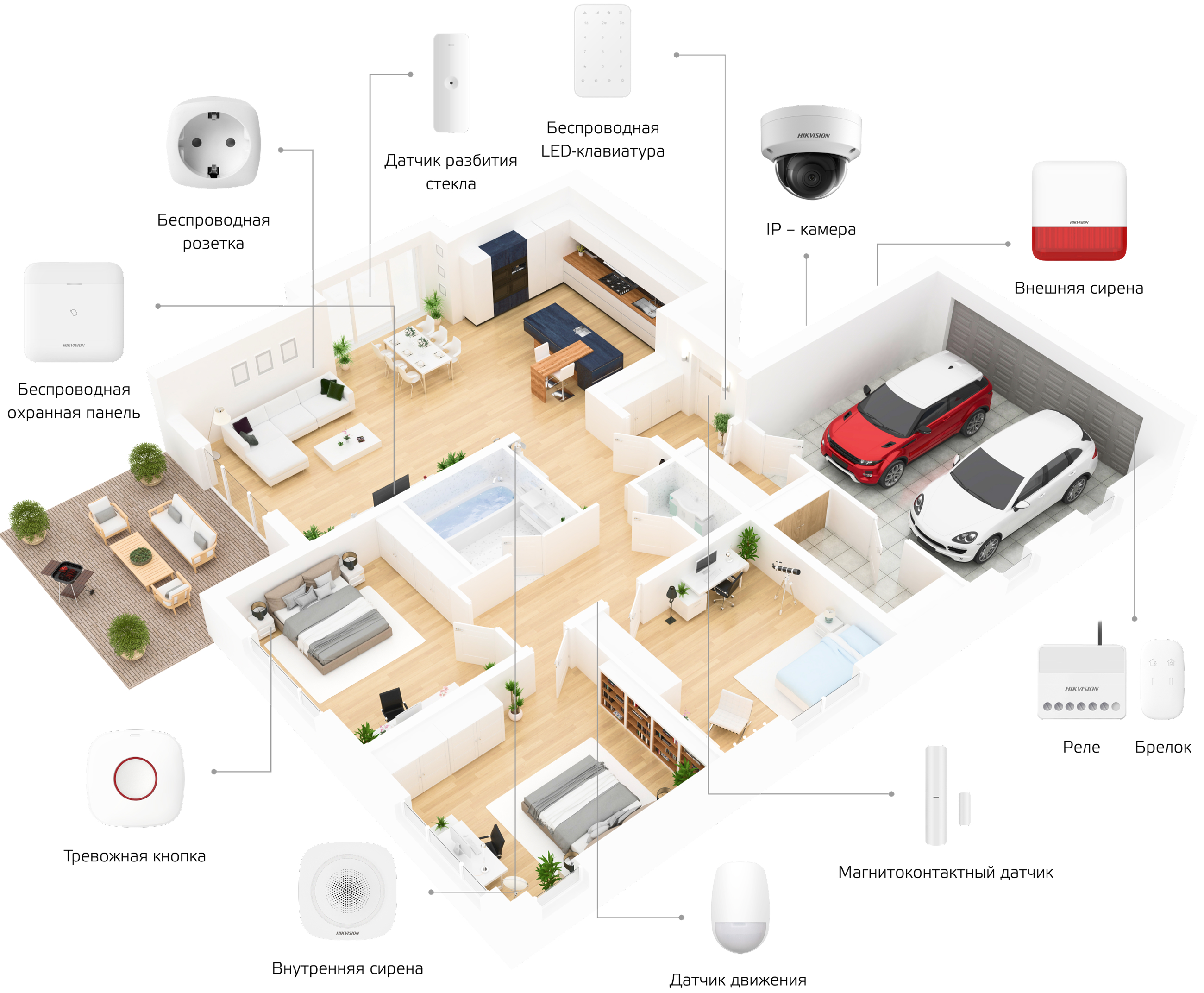 Мобильная кнопка SOS Дистанционное управление Онлайн доступ к камере Частичная охрана Дополнительные возможности